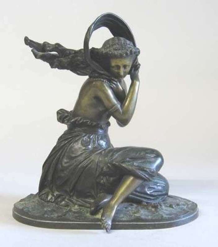 Yellow-brown patina, depicting a seated classically draped maiden, her hair and head scarf blowing in the wind.