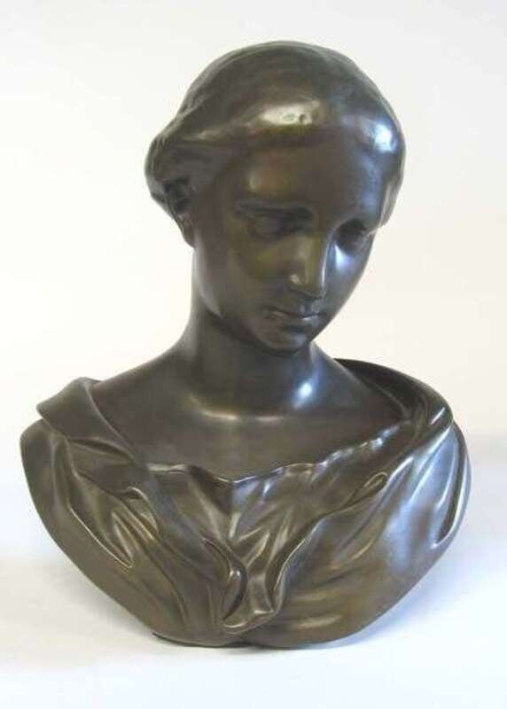 Bronze, medium brown patina, bust of a woman, inscribed 'Vierge d'apres Raphael' and stamped '22235'.
