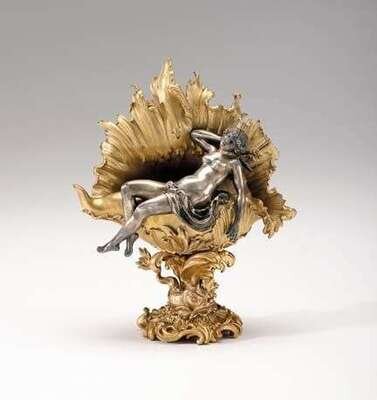 Gilt and silver-gilt bronze, modeled as a reclining nude female rising on a conch shell held aloft by waves, with a dolphin cast rococo scroll base.