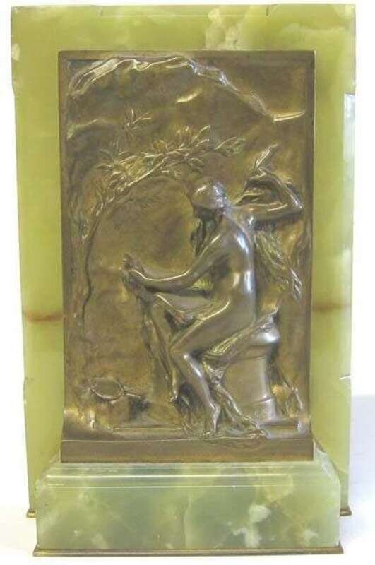 Gilt bronze relief plaque depicting a female nude writing, signed H. Chapu, with Thiebaut Freres, Paris foundry mark, mounted on a green onyx back with bronze underplate. .