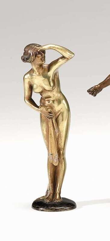 Polychrome and patinated bronze, modeled as a standing nude female, her left arm raised to shield her eyes, signed P. Tuch. .
