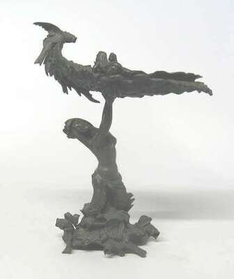 Dark brown patina, the shell-form bowl held aloft by a mermaid, on a shell and fish cast base.