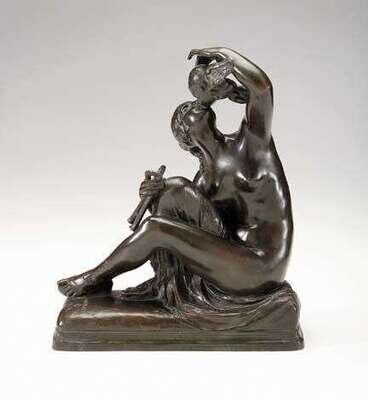 Bronze, green brown patina, modeled as a seated nude female, holding pipes in her hand and raising her head to kiss an angel, signed Albin Polasek and dated 1914, and inscribed 'Roman Bronze Works, N.Y.'.
