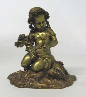 Bronze, yellow patina, modeled as a child holding a sickle while seated on sheaves of wheat, stamped 'LM' to underside. .