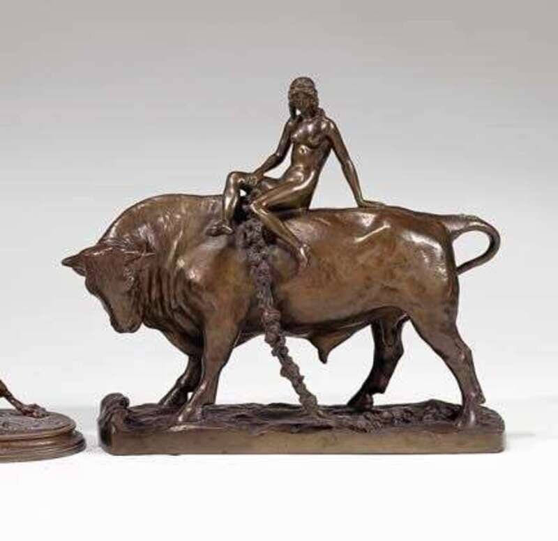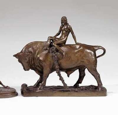Bronze, dark brown patina, modeled as Europa seated on the the back of a bull, signed LH Wislicenus. .