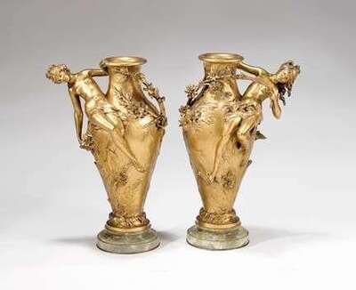 Pair of gilt bronze Art Nouveau vases, signed L&F Moreau, raised on round onyx bases. .