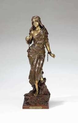 Bronze, yellow, green and brown patina, signed E. Villanis, with Societe de Bronzes de Paris foundry seal and stamped B / 4227, with inscription plate 'Le Personnel de Vaucluse / a Monsieur Euziere / Directeur des postes et telegraphes / 30 Novembre 1897' to base.