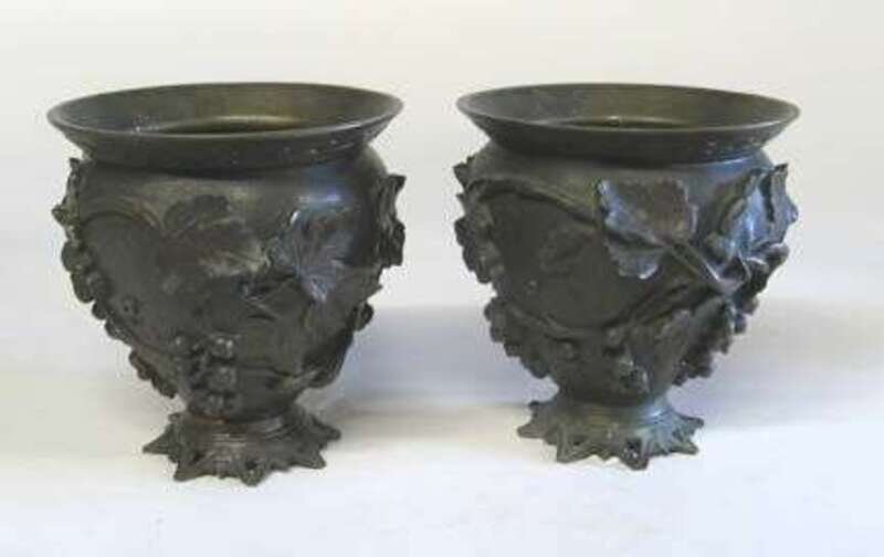 Each decorated in high relief with scrolling grapevines, on a pierced foot rim.