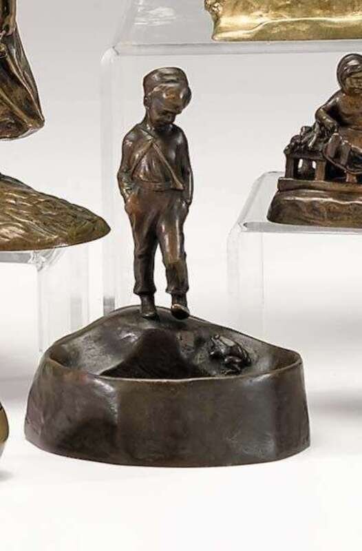 Vide poche, bronze, medium brown patina, modeled as a young boy observing a frog, signed P. Tereszczuk, Aust-Reich, Vienna, foundry mark, stamped 'Made in Austria'.
