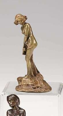 Bronze, yellow and light brown patina, modeled as nude maiden, her shoes in her hands, looking at a lizard at her feet, signed P. Tereszczuk, with Aust-Reich foundry mark. .
