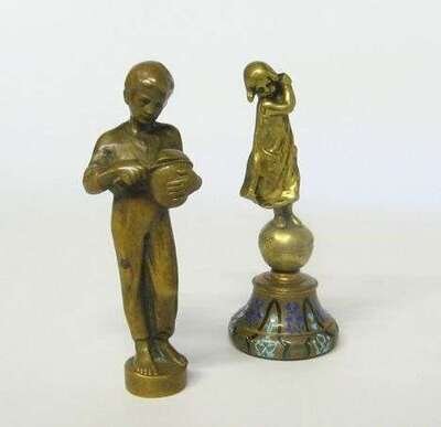 Bronze, light brown patina, modeled as a boy slicing a loaf of bread, signed P. Tereszczuk; together with a bronze figure of a girl, yellow patina, standing on an orb, and raised on an enameled base, signed P. Tereszczuk. (2).