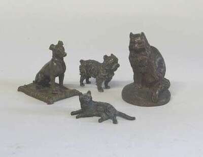 Comprising a seated cat, a reclining cat, and two different models of terriers. (4).