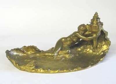 Gilt bronze, modeled as a female nude embracing a conch shell, the top opening to reveal the ink reservoir, signed Ledru, stamped CA to the underside. .