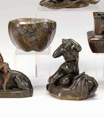 Bronze figural covered dish, formed as a nude beauty seated on an apple looking into a mirror, a cherub climbing to one side.