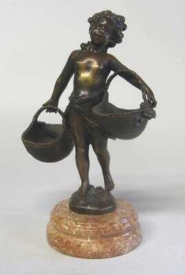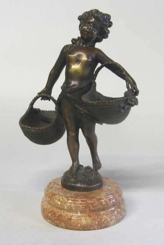Medium brown patina, depicting a young girl carrying large flower baskets, raised on a red marble base.