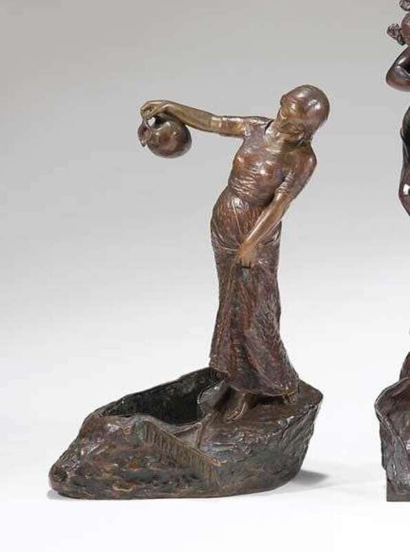 Bronze, red brown patina, modeled as a female farm laborer standing on a rock, pouring water into a pool from a jug, her rake at her feet.