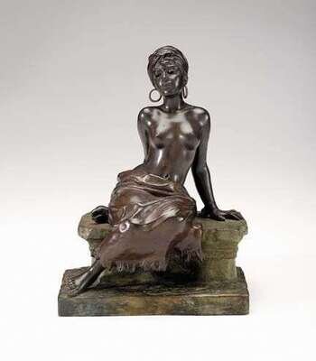 Bronze, dark brown and green patina, modeled as a nude slave girl with a removable cloth across her lap, signed E. Villanis.