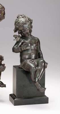 Bronze, dark brown patina, modeled as a child, a bird on his shoulder, seated on a squared black marble base. .