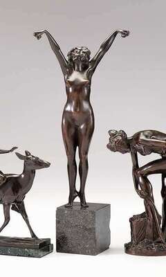 Medium brown patina, depicting a nude female, her arms raised playing the castanets, on a square black marble base.
