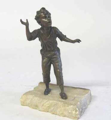 Medium brown patina, modeled as a boy in tattered clothes, on a rough-cut white marble base.