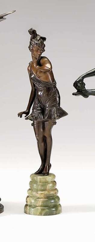 Medium and dark brown patina, depicting a scantily clad young lady, raised on a stepped green onyx base.