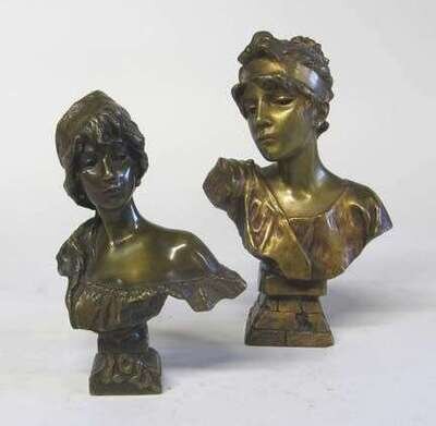 Bronze bust of a woman, signed Villanis and stamped 827; together with a smaller bust of a woman, titled 'Lola', signed E. Villanis, and stamped EV 54. (2).