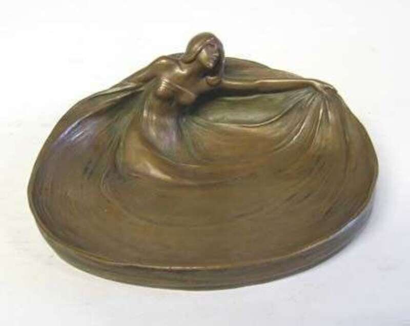 Bronze vide poche, light brown patina, modeled as an Art Nouveau lady, her dress spread to form a dish, signed P. Tereszczuk.
