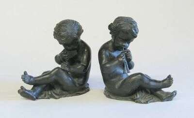 Modeled as draped putti, one playing the pipes, the other a flute.