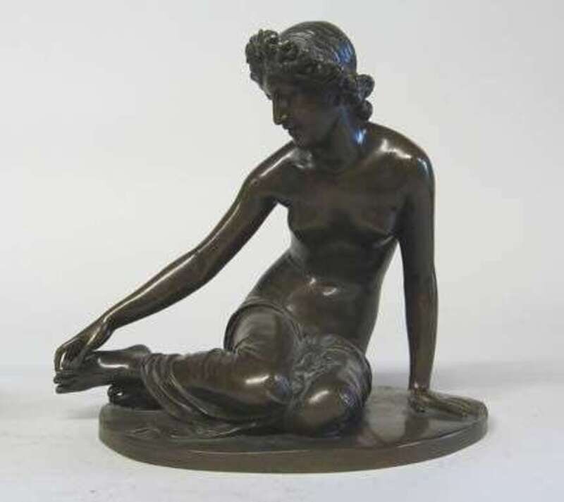 Bronze, medium brown patina, depicting a semi-nude seated maiden, with stamped foundry seal 'Reduction Mecanique, A. Collas, Brevete'. .