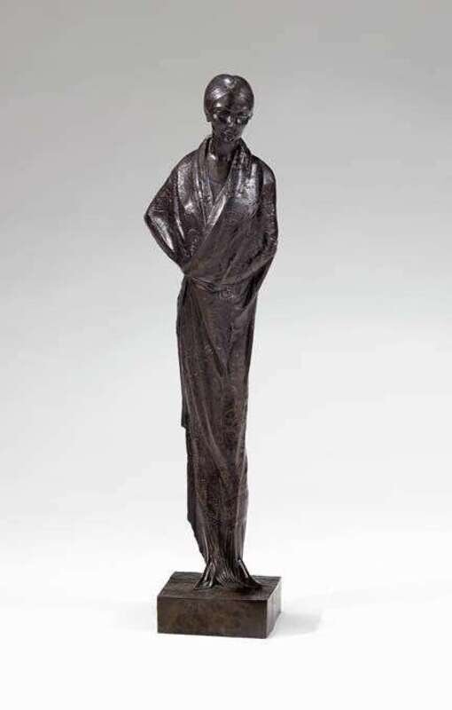 Bronze, dark brown patina, depicting a woman wrapped in a robe, signed 'Bonome 19**' and with Cire Perdue / Le Blank Barbedienne / Paris foundry stamp.