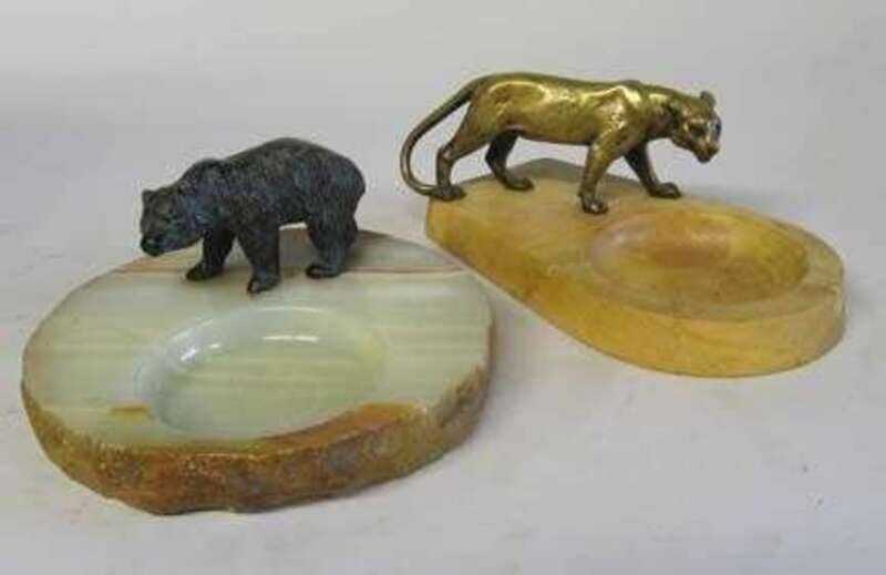 Modeled as a panther, on a sienna marble base; together with another vide poche with a bronze figure of a bear. (2).