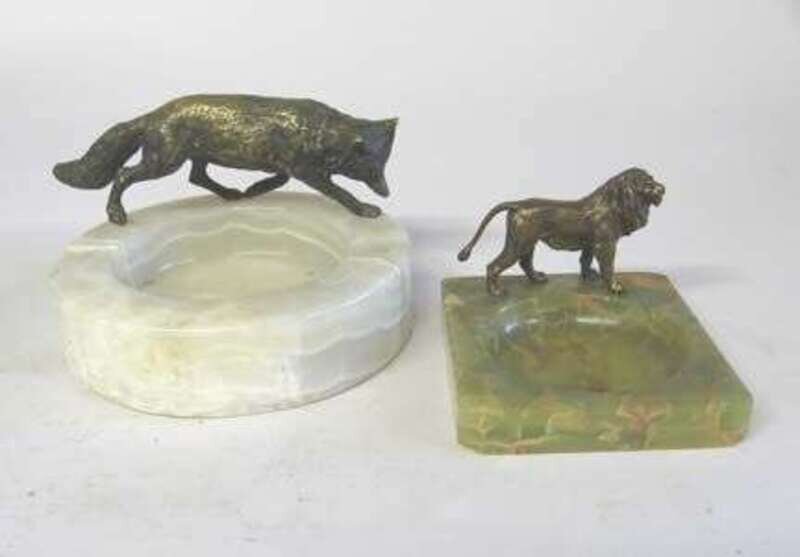 Modeled as a fox mounted on a white onyx base; together with an Austrian bronze figure of a lion mounted on a square green onyx vide poche. (2).