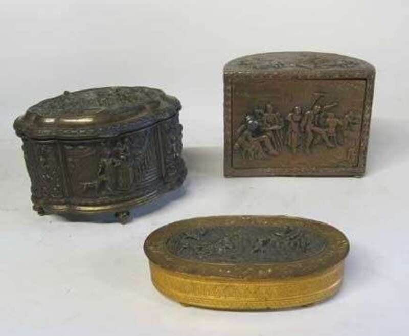 The first example in bronze of oval paneled form with scenes of couples dancing in a garden; the second example of demi-lune form depicting tavern scenes, with a revolving back to reveal a silver plated interior; the third example of oval form with a scene of courting couples in a landscape. (3).