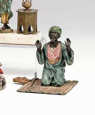 Modeled as an Arab kneeling on a tasseled carpet to pray, his rifle and shoes by his side, Bergman amphora, impressed GESCHUTZT.