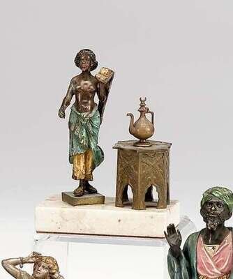 Depicting a semi-nude African maiden beside a table with a tea urn, the table top opening as an inkwell, on a rectangular white marble base.