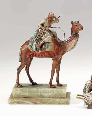 Modeled as an Arab holding a rifle seated on a camel, raised on a green onyx base.