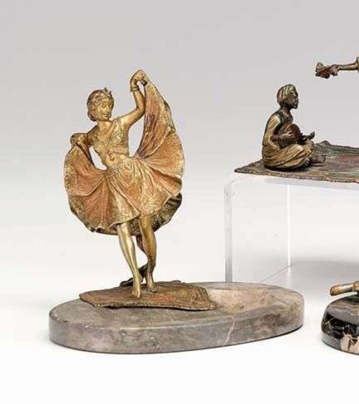 Modeled as harem dancer on a rug, her skirt opening to reveal her nude, mounted on a gray marble vide poche.