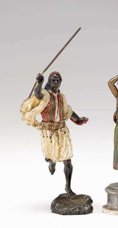 Holding spear or staff in one hand, wearing flowing drapery and breeches, an embroidered waistcoat and tassled fez, on a naturalistic base, impressed Bergman amphora, GESCHUTZT.