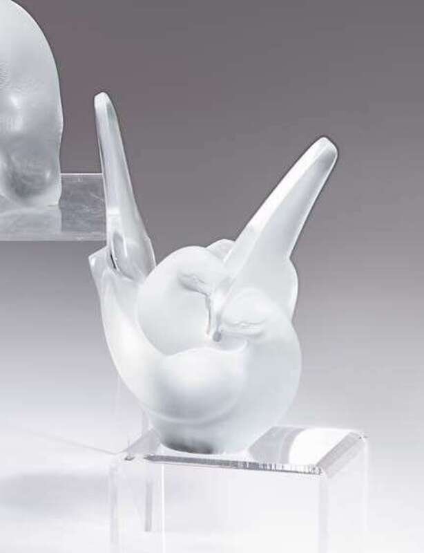 Modeled as a pair of stylized birds, with conforming stemmed frog insert, etched 'Lalique, France' signature to base with paper label model no. 12258.