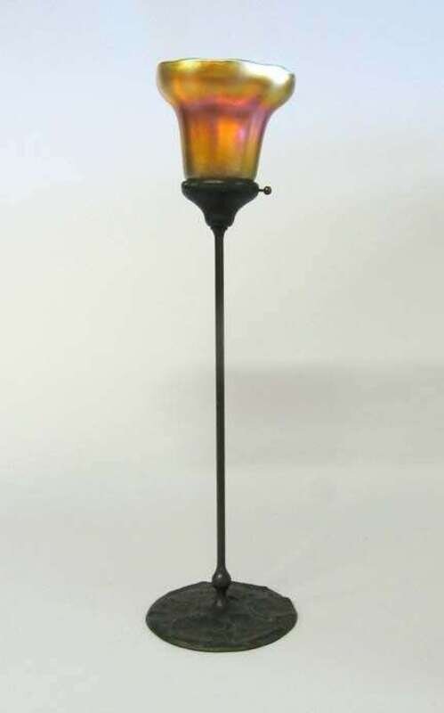 With a gold iridescent shade, the slender shaft with a lily pad molded circular foot, numbered 2044 with a pseudo Tiffany Glass and Decorating Co. monogram to the underside.
