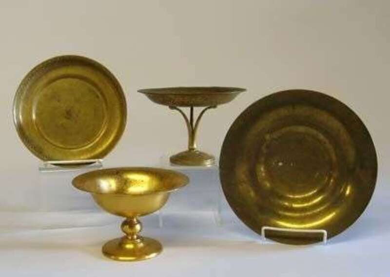 Stamped and numbered Louis C. Tiffany Furnaces Inc. Favrile 515 with monogram; together with a Tiffany Studios bronze compote and two plates, all stamped Tiffany Studios New York and numbered 1726, 1704 and 1708 respectively (4).