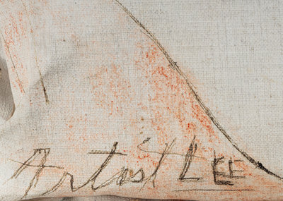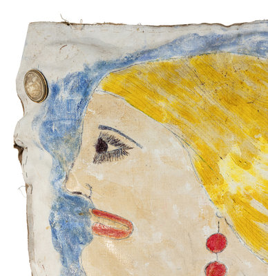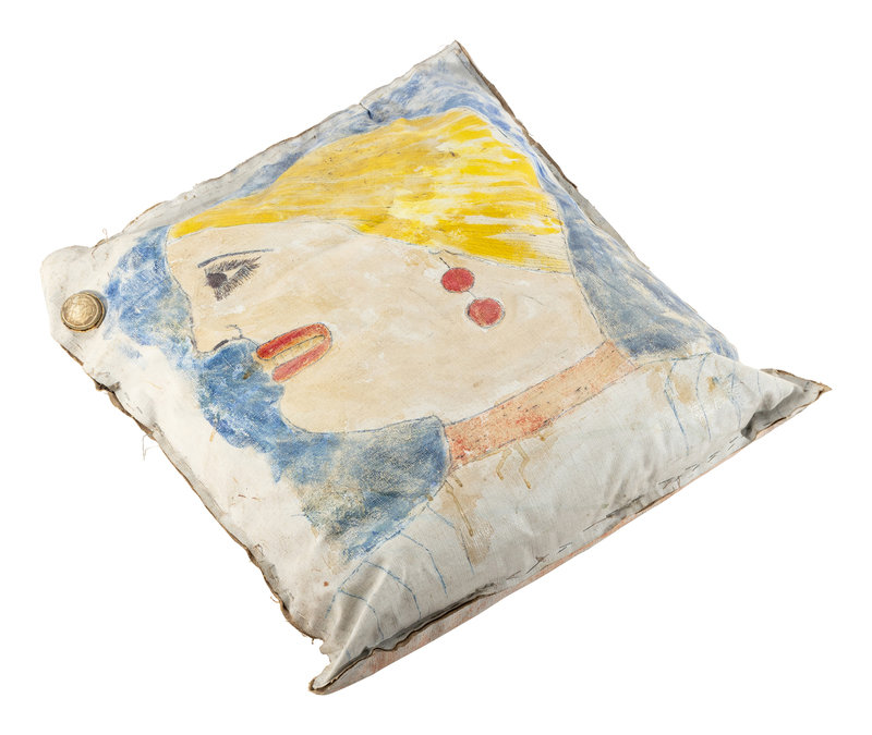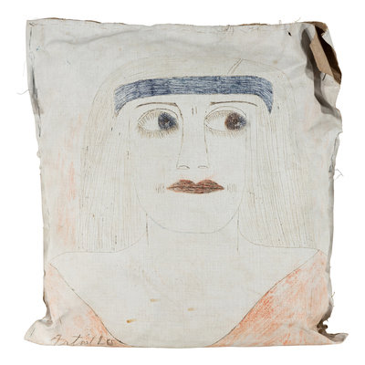 ink, watercolor and collage on stuffed pillowcase, double-sided