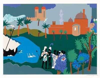 ROMARE BEARDEN (AMERICAN 1912-1988) "ODYSSEUS LEAVES" FROM THE ODYSSEUS SUITE OF SIX COLOR SCREENPRINTS