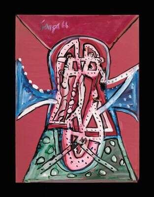 Signed and dated "Souza 66" upper left, inscribed verso "Estate of F N Souza / Shelley WC1-001", watercolor and ink on red paper, unframed