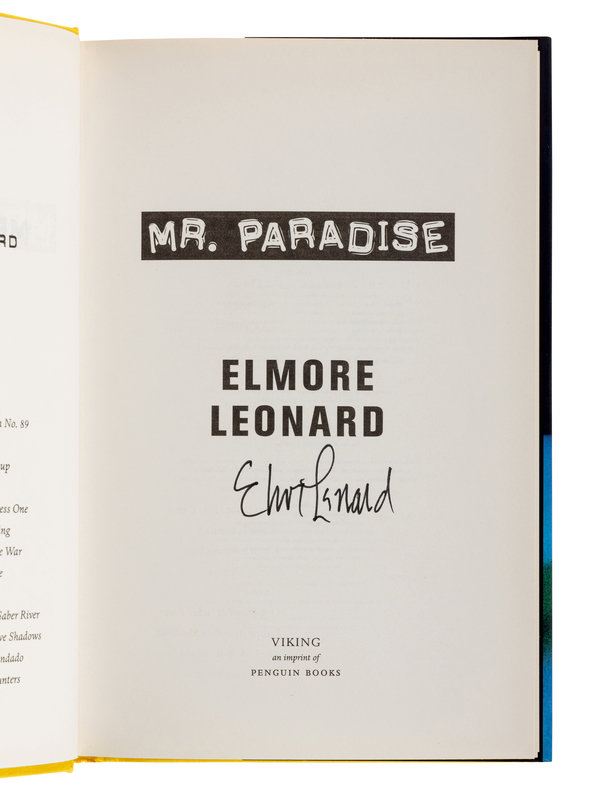 11) Mr. Paradise. New York: Viking Press, 2004. Original cloth; publisher’s dust jacket. PRESENTATION COPY, INSCRIBED BY LEONARD.