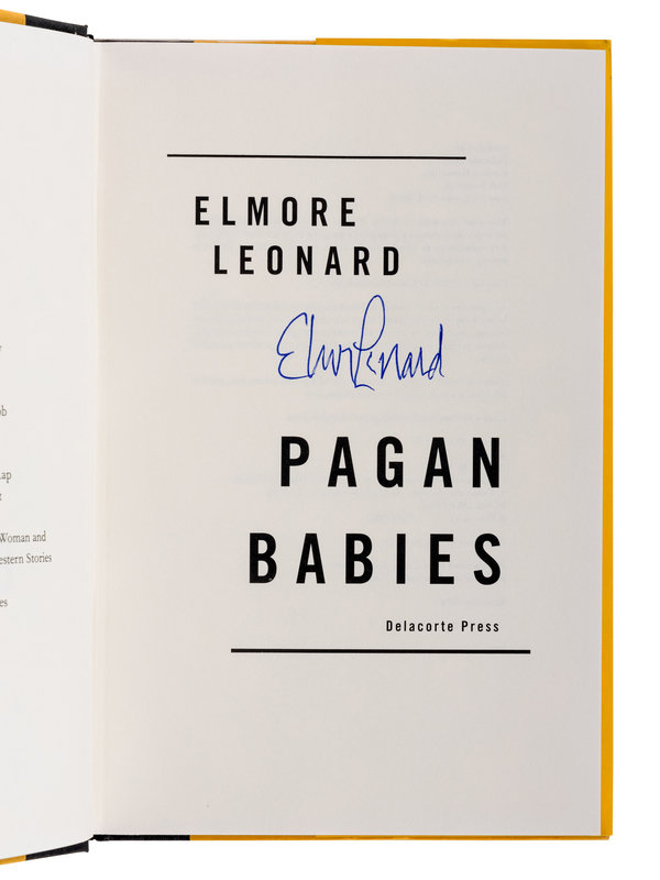 5) Pagan Babies. New York: Delacorte Press, 2000. Original cloth; publisher’s dust jacket. PRESENTATION COPY, INSCRIBED BY LEONARD.