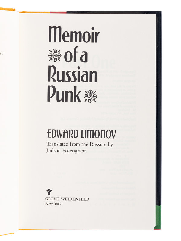 [With:] LIMONOV. Memoir of a Russian Punk. Judson Rosengrant, translator. New York: Grove Weidenfeld, [1990]. 8vo. Original cloth-backed boards; publisher’s dust jacket (a few tiny short tears). FIRST AMERICAN EDITION of Limonov’s third novel, published right before he returned to Russia in 1991 and founded the National Bolshevik Party.