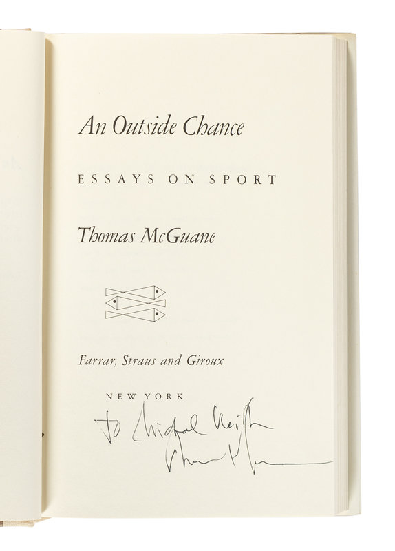 4) An Outside Chance: Essays on Sport. New York: Farrar, Straus, & Giroux, 1980. Original cloth; publisher's dust jacket. FIRST EDITION. INSCRIBED BY MCGUANE.