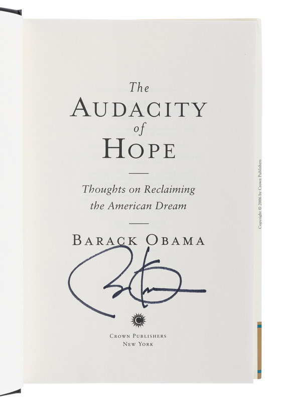 FIRST EDITION, FIRST ISSUE. SIGNED BY PRESIDENT OBAMA. The title The Audacity of Hope was taken from Obama’s 2004 Democratic National Convention keynote address, which would propel him to national recognition.