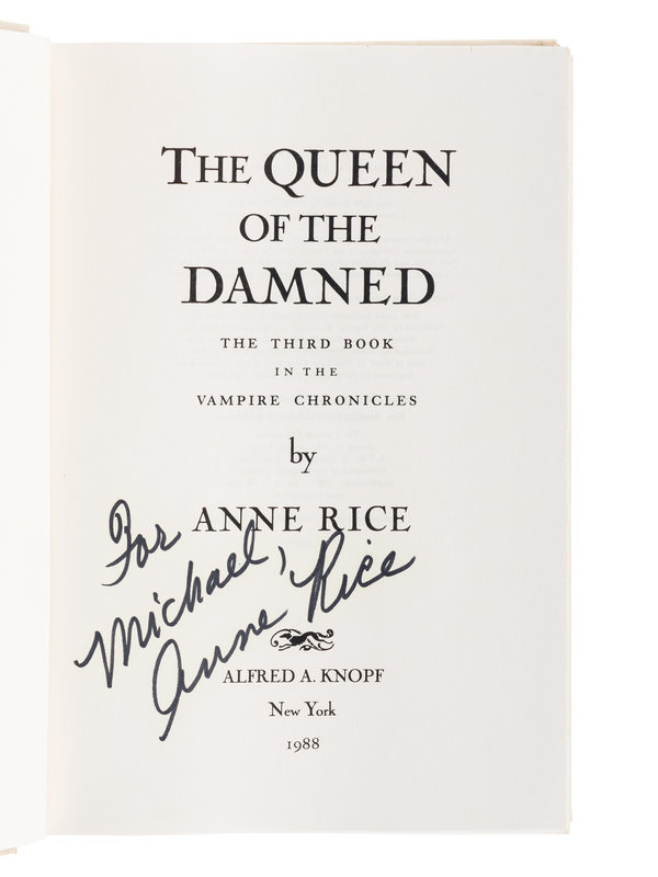 2) The Queen of the Damned. New York: Alfred A. Knopf, 1988. FIRST EDITION. PRESENTATION COPY, INSCRIBED BY RICE.